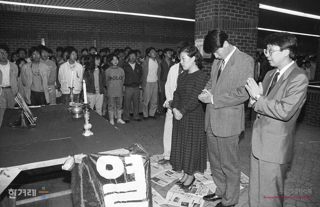 - 1991년 5월 2일 명지대생들이 서울 시청 지하철역 구내에 설치한 고 강경대씨 분향소에서 시민들이 강씨의 명복을 빌려 조문을 하고 있다.