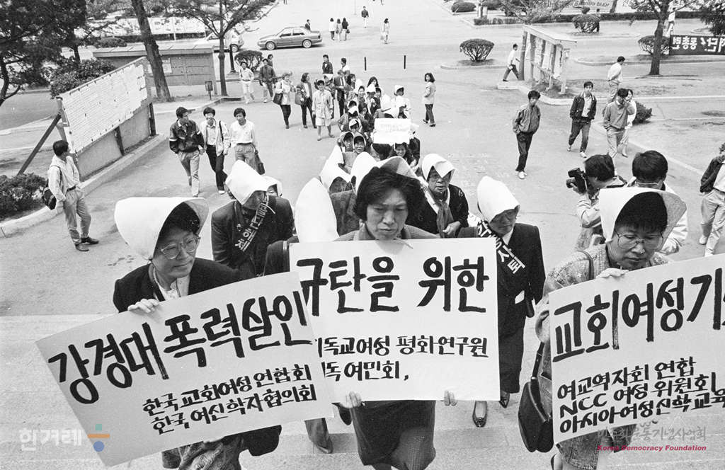 - 1991년 5월 2일 오전11시 한국교회여성연합회 등 8개 교회여성단체 회원 50여명이 머리에 삼베수건을 쓰고 서울 세브란스병원 영안실에서 조문한 뒤 연세대 학생회관 4층 대책회의 농성장으로 행진을 하고 있다.