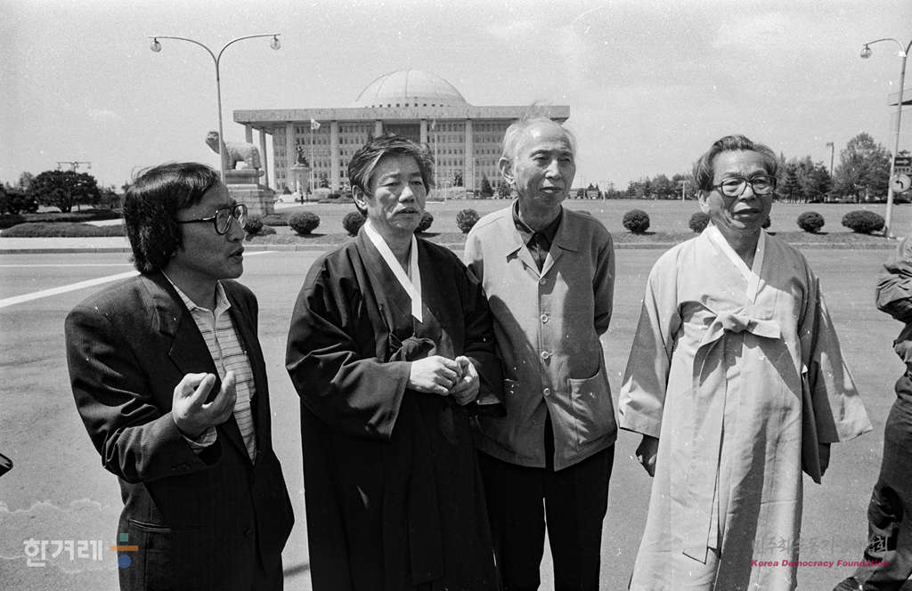 - 1991년 5월 3일 오후2시 강희남 계훈제 전문련 고문, 권종대 전농의장, 백기완 전노협 고문, 권영길 언론노련 위원장 등 명지대생 강경대씨 타살사건의 범국민 대책회의 대표들이 정치권의 각성을 촉구하는 항의서한을 전달하기 위해 박준규 국회의장이 있는 국회로 향하고 있다.