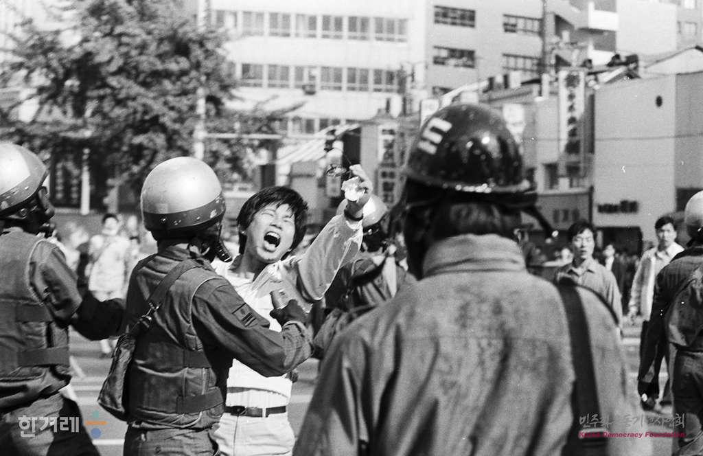 - 1991년 5월 3일 전대협 소속 대학생들이 경찰의 강경대씨 타살에 항의하기 위해 서울 서대문구 미근동 치안본붕 가려다 인근 서대문 네거리에서 경찰의 저지를 받고 있다.