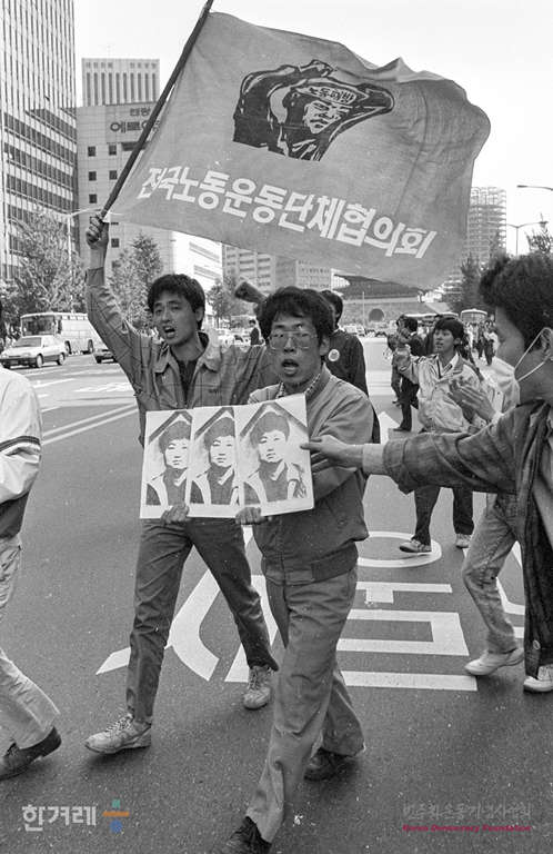 - 1991년 5월 3일 서울을 비롯한 전국 주요도시에서 백골단 전경 해체 및 공안통치 종식을 위한 범국민 궐기대회를 하루 앞두고 서울 남대문인근에서 전교조를 비롯한 노동단체 회원들이 강경대열사의 영정을 앞세우고 거리시위를 벌이고 있다.
