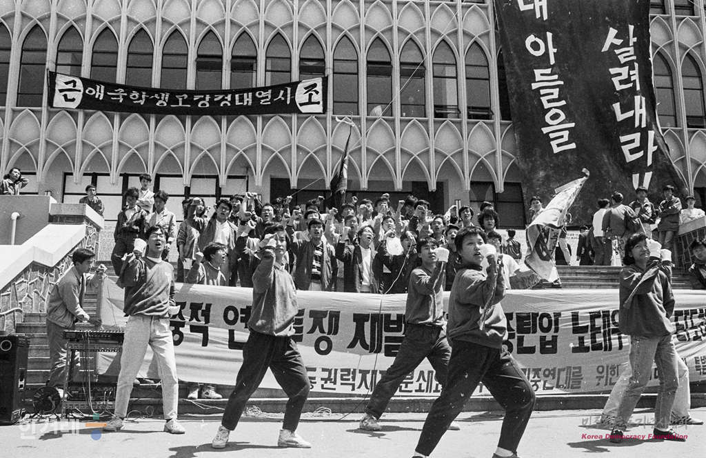 - 1991년 5월 3일 명지대생 강경대씨 타살사건에 항의하는 대학생들의 규탄집회가 전국적으로 잇따르는 가운데 강씨가 안치중인 세브란스병원옆 연세대 교정에서 민중연대를 위한 동아리 특별연합회 소속 대학생들이 규탄집회를 갖고 있다.