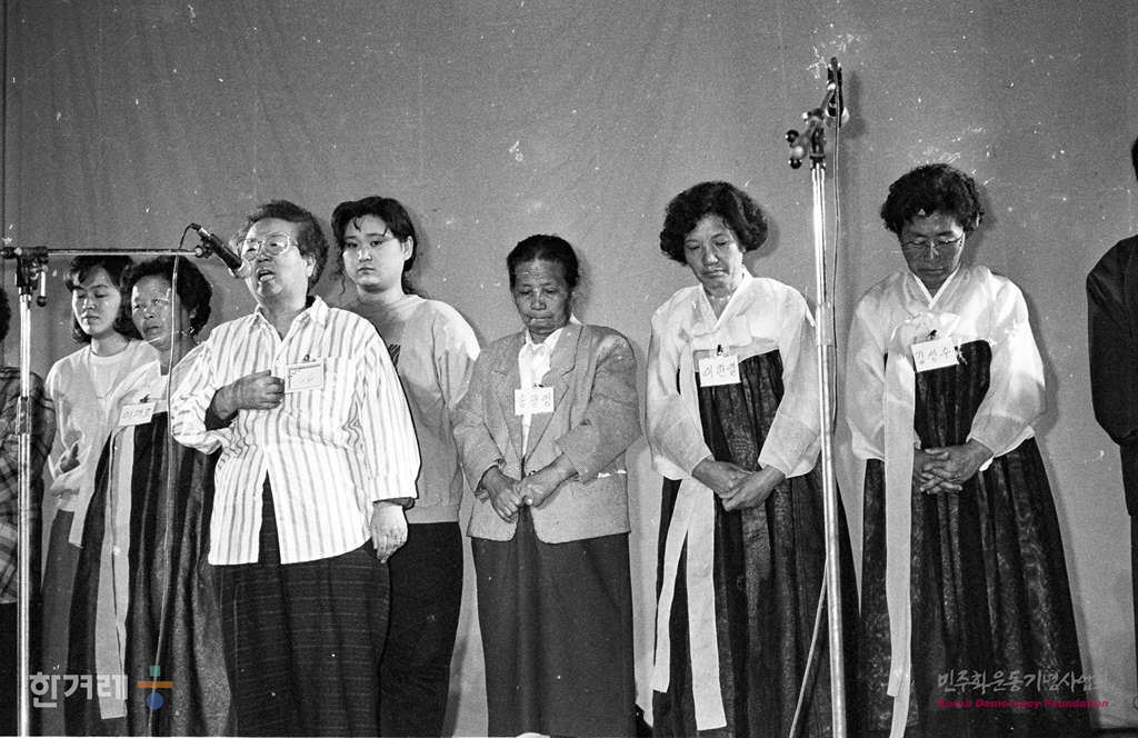 - 1991년 4월 27일 전국민족민주유가족협의회 소속 어머니들의 노래공연이 어머니의 노래 가 서울 연세대 대강당에서 열리고 있다.