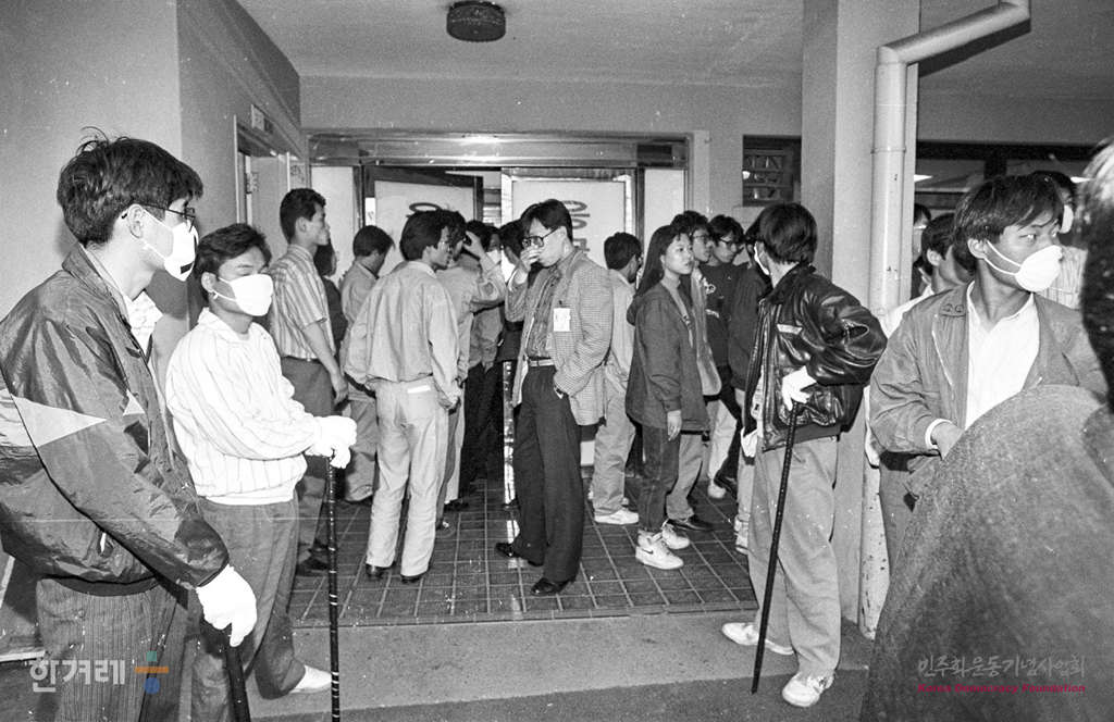 - 1991년 5월 3일 명지대생 강경대씨 타살사건에 항의하는 대학생들의 규탄집회가 전국적으로 잇따르는 가운데 경기도 성남시 복정동 경원대 창조관 건물3층에서 몸에 불을 붙인 채 뛰어내려 위급한 경원대 대학생인 천세용씨가 한강성심병원을 거쳐 세브란스병원에 도착하자 학생들이 입구를 지키고 있다.