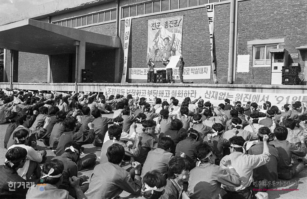 - 1991년 5월 3일 직업병 치료 보상과 작업환경 개선 등을 요구하며 전면파업에 들어간 원진레이온 노조 조합원들이 회사 본관 앞마당에서 모여 파업 승리 결의대회를 하고 있다.