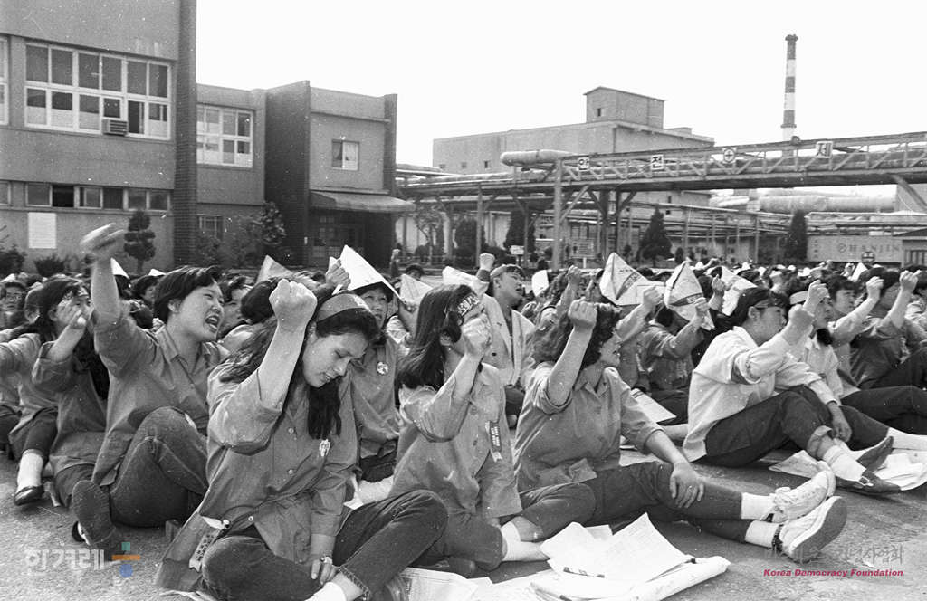 - 1991년 5월 3일 직업병 치료 보상과 작업환경 개선 등을 요구하며 전면파업에 들어간 원진레이온 노조 조합원들이 회사 본관 앞마당에서 모여 파업 승리 결의대회를 하고 있다.