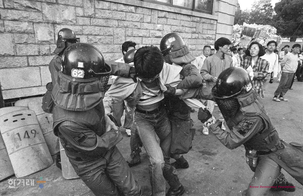 - 1991년 5월 3일 전대협 소속 대학생들이 경찰의 강경대씨 타살에 항의하기 위해 서울 서대문구 미근동 치안본붕 가려다 인근 서대문 네거리에서 경찰의 저지를 받고 있다.