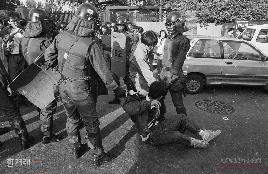 - 1991년 5월 3일 전대협 소속 대학생들이 경찰의 강경대씨 타살에 항의하기 위해 서울 서대문구 미근동 치안본붕 가려다 인근 서대문 네거리에서 경찰의 저지를 받고 있다.