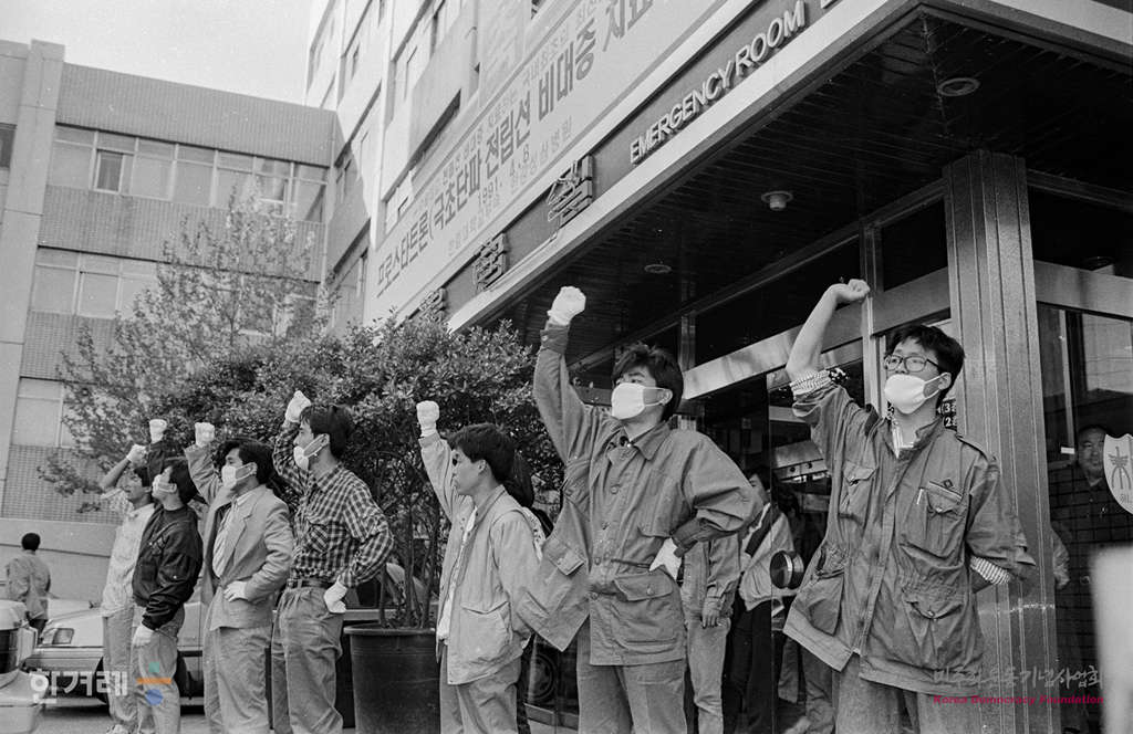 - 1991년 5월 3일 명지대생 강경대씨 타살사건에 항의하는 대학생들의 규탄집회가 전국적으로 잇따르는 가운데 경기도 성남시 복정동 경원대 창조관 건물3층에서 몸에 불을 붙인 채 뛰어내려 위급한 경원대 대학생인 천세용씨가 한강성심병원을 거쳐 세브란스병원에 도착하자 학생들이 입구를 지키고 있다.