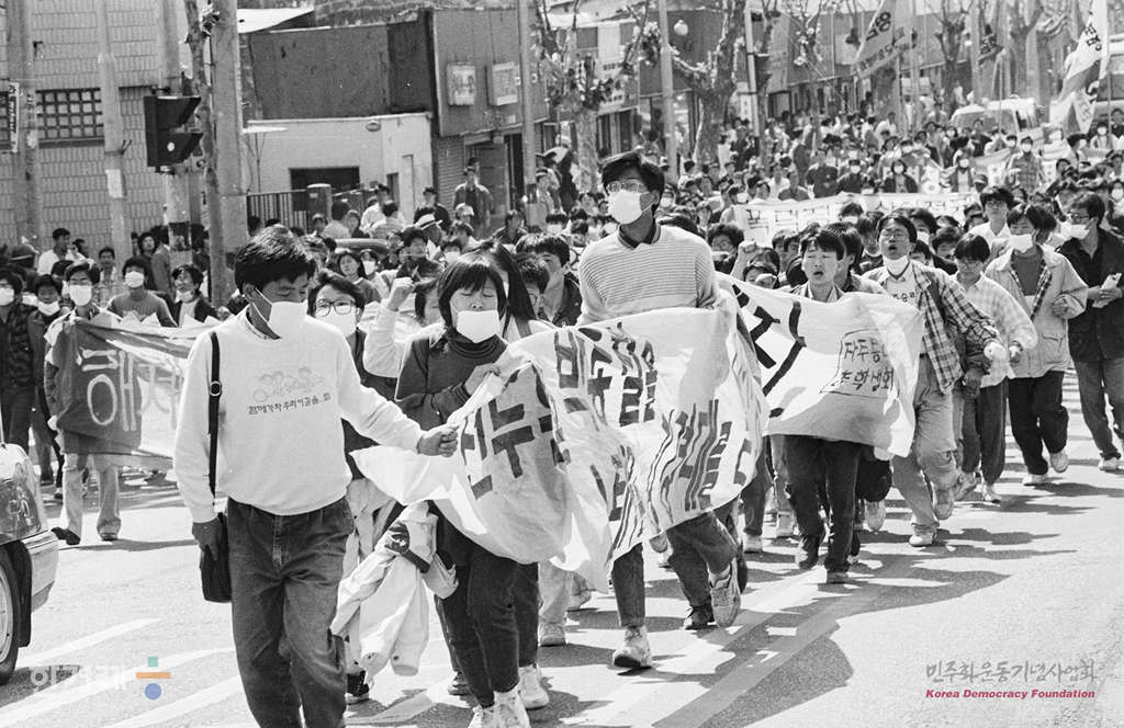 - 1991년 5월 4일 오후 1시 20분 강경대씨 타살사건에 항으해 분신자살해 2일 숨진 안동대생 김영균씨의 장례식이 경북대병원 영안실에서 유족과 친지 대학생 등 5백여명이 참석한 가운데 치러지고 있다. 장례식은 애초 가족장을 주장하는 유족에 의해 이날 오전 9시부터 치러질 예정이었으나 안동대생 1백여명이 화장 반대와 안동대 노제 등을 요구하며 저지하는 바람에 늦어졌다. 대학생 5벽여명은 경북대병원에서 3km 떨어진 대구시 동구 신천동 청구고교 앞길까지 대령태극기와 영정을 앞세우고 운구행령을 뒤따랐다.