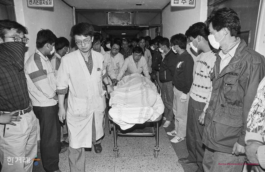 - 1989년 5월 2일 지난 1일 전경의 명지대생 강경대씨 구타살해에 항의 분신자살을 기도해 3도 화상을 입고 경북대병원에서 입원치료를 받아오던 안동대생 김영균시가 분신 31시간 40분만에 경북대병원 화상병동 3101호실에서 숨지면서 화사병동 앞마당에서 소생을 기원하며 집회를 갖고 있던 안동대생 1벽여명 등 학생 2백여명은 경찰이 주검을 ㅤㅌㅏㅎ취할 수도 있다는 지도부의 말에 따라 병원직원들이 밀고 나가던 김씨의 시신운반대를 에워싸고 있다.