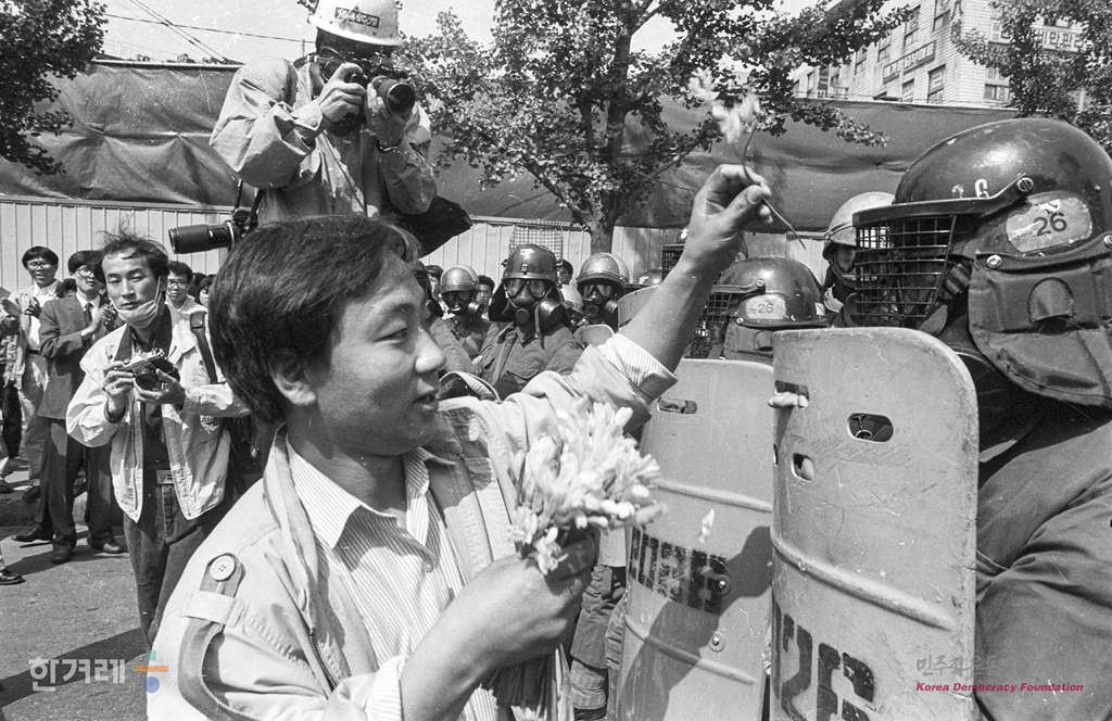 - 1991년 5월 4일 ‘고 강경대씨 폭력살인 규탄과 공안통치 종식 범국민대책회의’가 백골단 해체 투쟁의 날로 선포한 범국민권기대회가 서울 부산 등 전국 21개 지역에서 경찰의 원천봉쇄속에 강행된 가운데 서울 신세계백화점인근 도로에서 한 시민이 전경의 방석모에 꽃을 달아주고 있다.