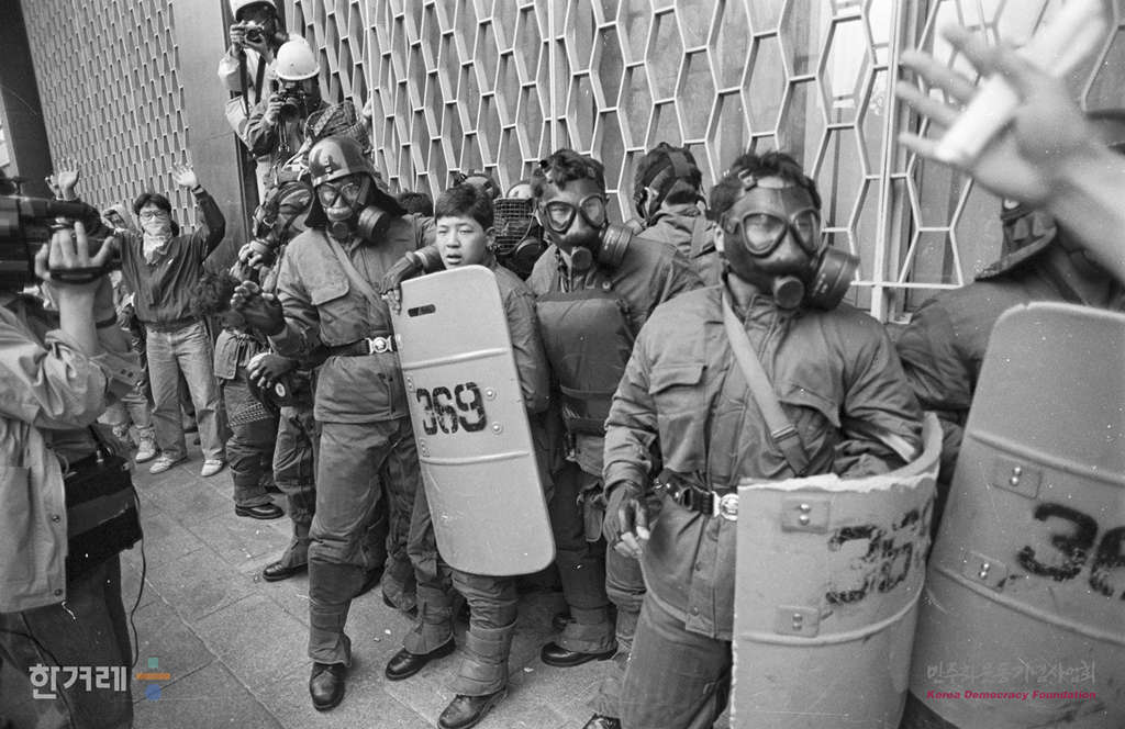 - 통치 종식 범국민대책회의’가 백골단 해체 투쟁의 날로 선포한 범국민권기대회가 서울 부산 등 전국 21개 지역에서 경찰의 원천봉쇄속에 강행된 가운데 서울 신세계백화점인근 도로에서 시민과 학생들이 가득메운 채 시위를 벌이자 가운데 갇히 경찰들이 난처한 표정을 짓고 있다.