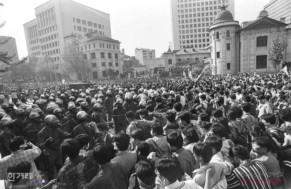 - 1991년 5월 4일 ‘고 강경대씨 폭력살인 규탄과 공안통치 종식 범국민대책회의’가 백골단 해체 투쟁의 날로 선포한 범국민권기대회가 서울 부산 등 전국 21개 지역에서 경찰의 원천봉쇄속에 강행된 가운데 서울 신세계백화점인근 도로에서 시민과 학생들이 가득메운 채 시위를 벌이고 있다.
