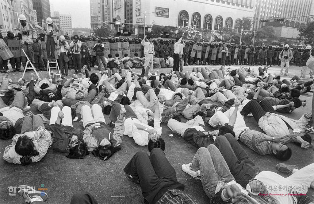 - 1991년 5월 4일 ‘고 강경대씨 폭력살인 규탄과 공안통치 종식 범국민대책회의’가 백골단 해체 투쟁의 날로 선포한 범국민권기대회가 서울 부산 등 전국 21개 지역에서 경찰의 원천봉쇄속에 강행된 가운데 서울 신세계백화점인근 도로에서 시민과 학생들이 거리에 누워 시위를 벌이고 있다.