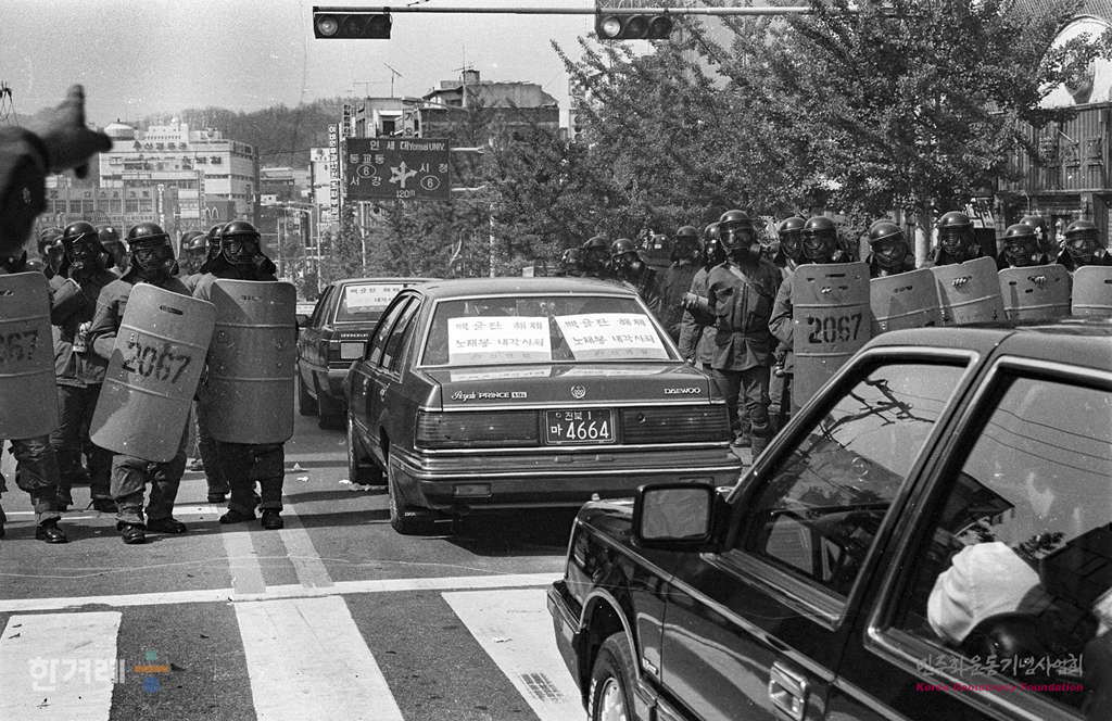 - 1991년 5월 4일 오후3시 백골단해체 구호가 적힌 선전물을 메단 신민당 차량시위대가 신촌로터리를 출발해 미리 정해진 코스를 따라 시가지를 돌아 최종 집결지인 세종문화회관으로 향하고 있다.