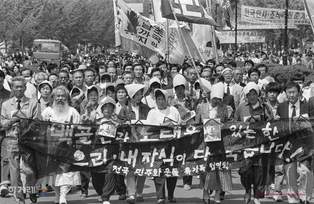 - 1991년 5월 4일 ‘고 강경대씨 폭력살인 규탄과 공안통치 종식 범국민대책회의’가 백골단 해체 투쟁의 날로 선포한 범국민권기대회가 서울 부산 등 전국 21개 지역에서 경찰의 원천봉쇄속에 강행된 가운데 서울 신촌로터리에 연세대 서강대 동교동 이화여대쪽 네 방향에서 시민 학생 5천여명이 한꺼번에 모여들며 경찰과 실랑이를 벌이고 있다.
