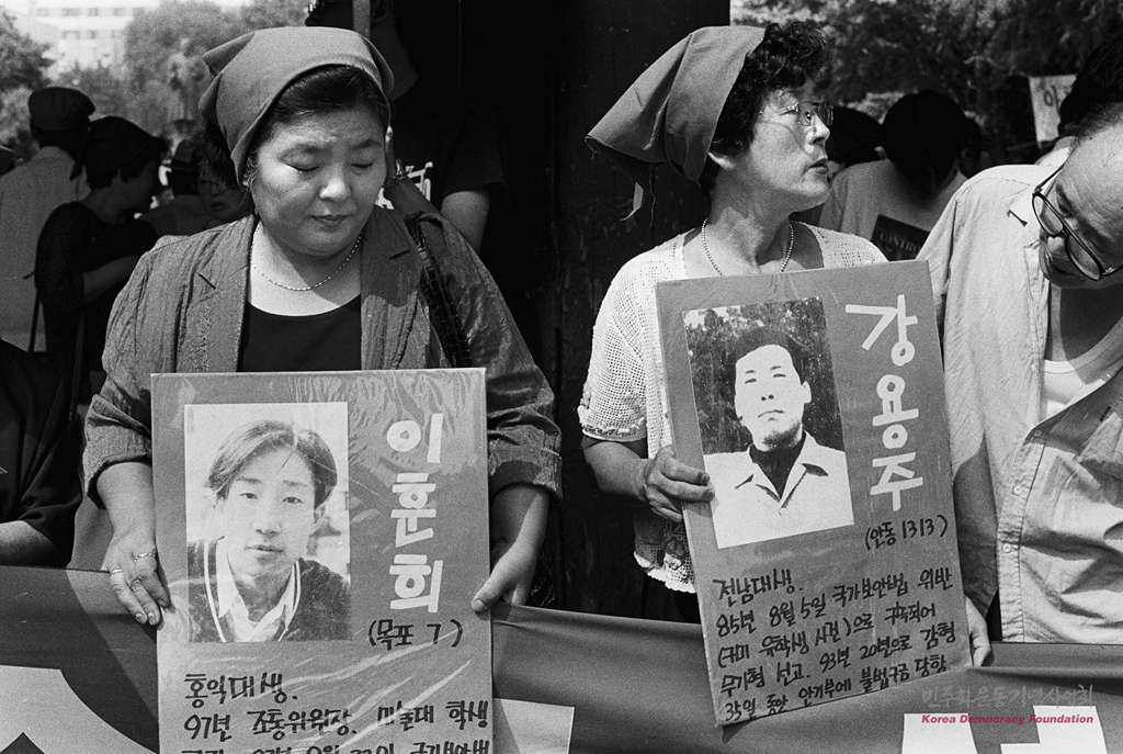 - 민가협 어머니 조순덕씨(왼쪽)와 김옥순씨가 감옥에 있는 양심수 이훈희와 강용주의 사진판을 들고 있다.
