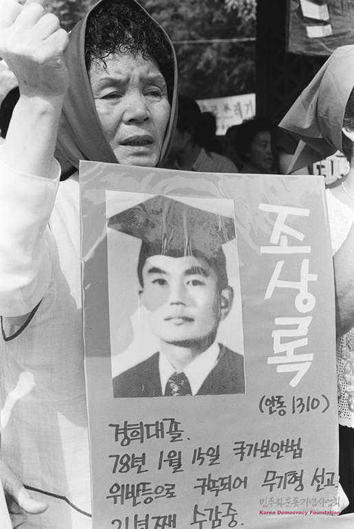 - 조상록의 누님이 양심수 조상록의 사진판을 들고 석방을 요구하고 있다.