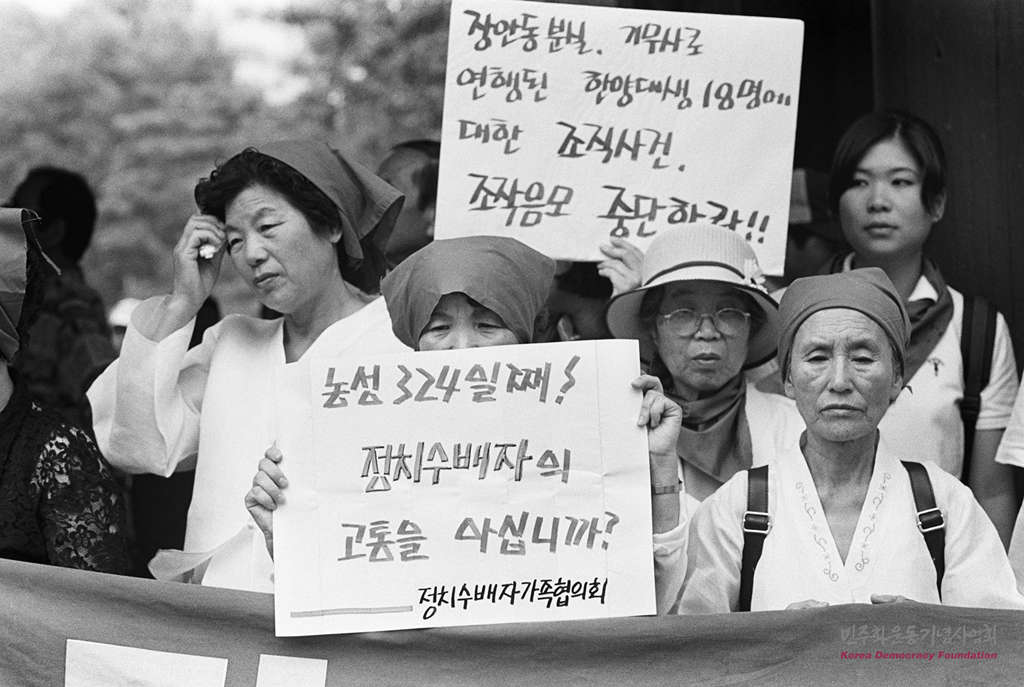 민가협 목요집회 287회 : '농성 324일째 정치수배자의 고통을 아십니까?' 피켓을 들고 있는 민가협 어머니
