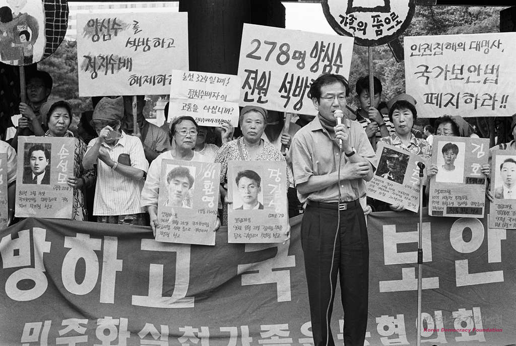 - 1979년 남민전 사건에 연루되어 프랑스에서 망명생활을 하다 귀국한 '빠리의 택시 운전사' 홍세화씨가 목요집회에 참석하여 양심수 석방을 촉구하고 있다.