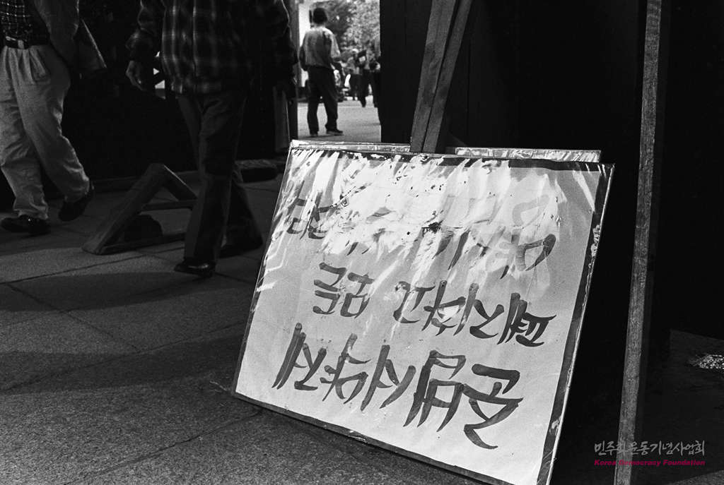 - 목요집회 시작 전 '준법서약서를 폐지하고 모든 양심수를 석방하라!' 피켓이 거꾸로 세워져 있다.