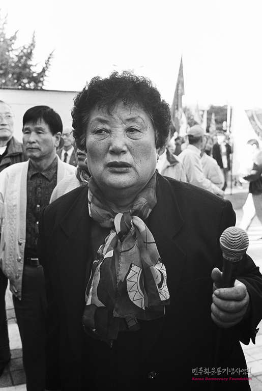 - 임기란 민가협 상임의장이 여의도 집회장에서 마이크를 들고 서 있다.
