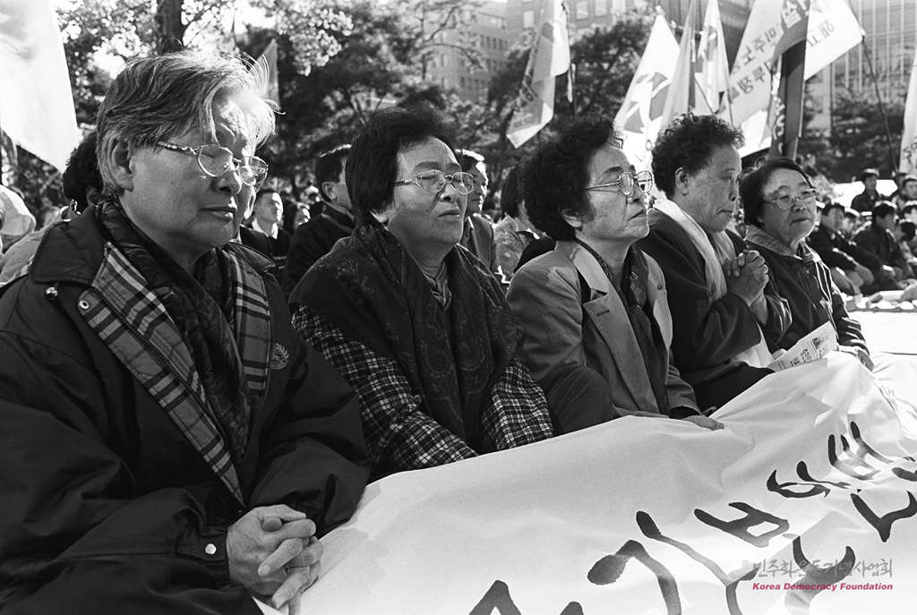 - 민가협, 유가협 어머니들이 '국가보안법 철폐' 플래카드를 앞에 두고 여의도 거리에 앉아 있다.