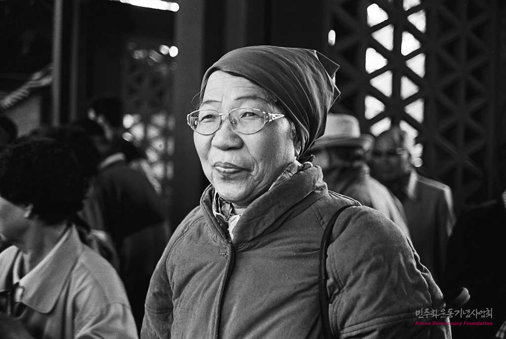 - 민혁당 사건으로 수감중인 하영옥의 어머니, 권성희씨가 목요집회에 참석하기 위해 삼일문 앞에 들어서고 있다