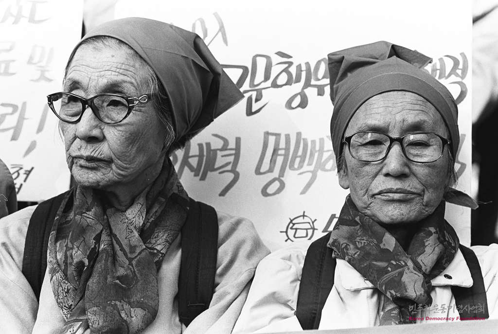 - 통일운동가 박정숙씨(왼쪽)와 김선분씨가 목요집회에 참석하고 있다.