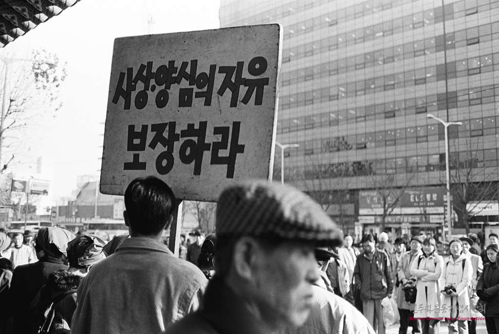 민가협 목요집회 308회 : '사상·양심의 자유 보장하라' 피켓을 들고 있는 집회 참가자