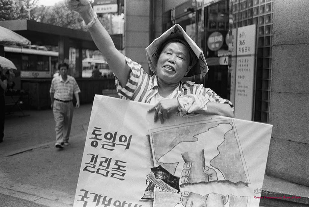 민가협 목요집회 334회 : '통일의 걸림돌 국가보안법 철폐하라' 피켓을 들고 있는 김순심 민가협 어머니