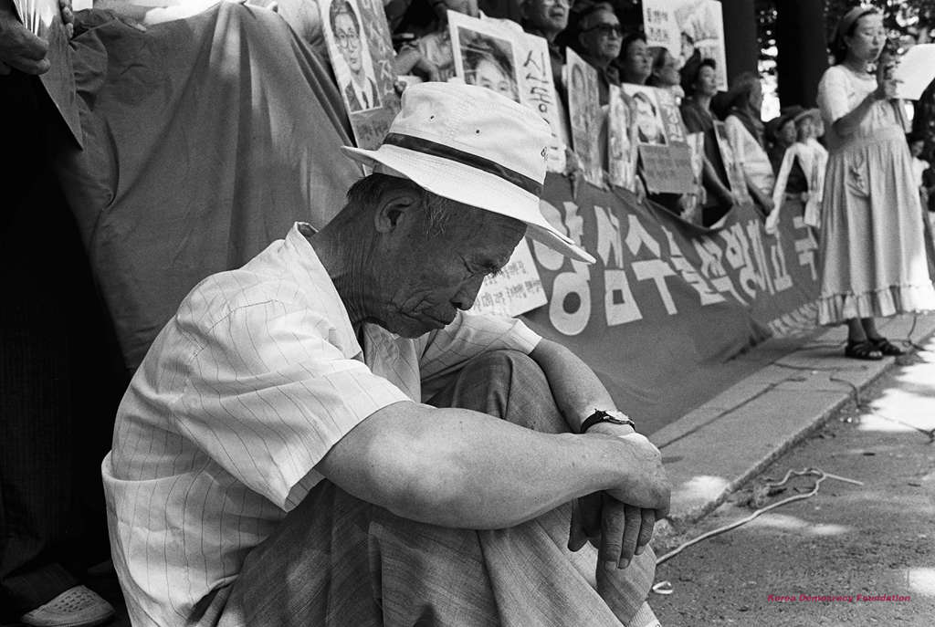 - 중절모를 쓴 할아버지가 '양심수를 석방하고 국가보안법 철폐하라' 가 쓰인 플래카드 가장자리에서 졸고 있다.