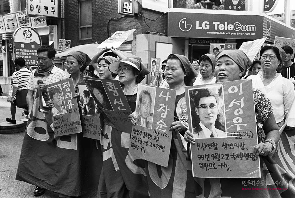 - 민가협, 유가협 어머니들이 양심수 사진판을 들고 명동거리에서 행진하고 있다.(앞줄 오른쪽부터 김순심씨, 정순녀씨)