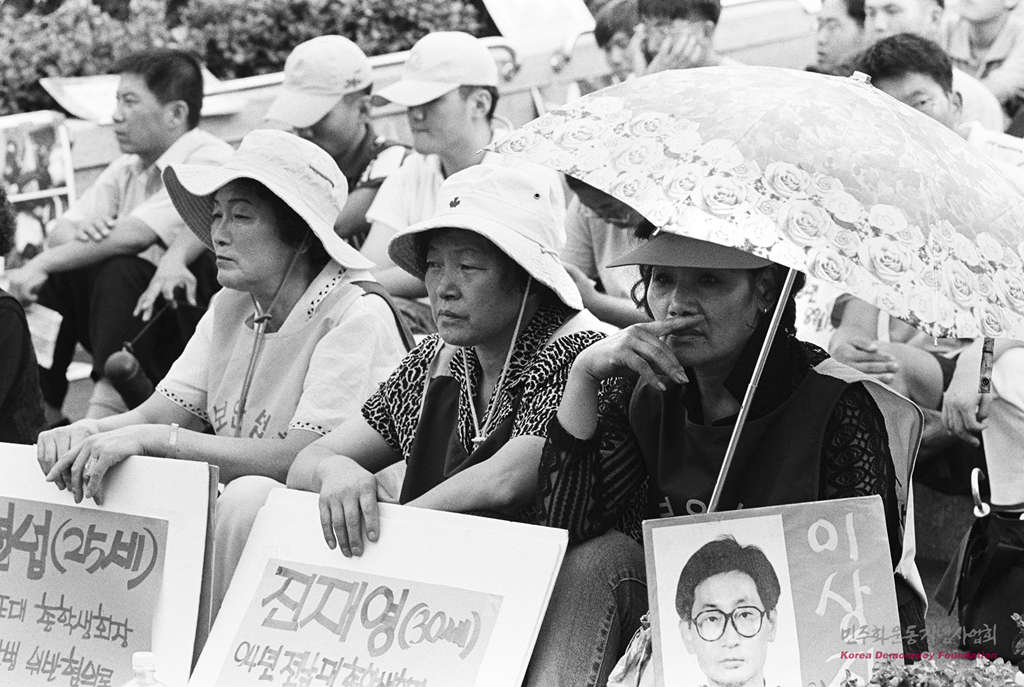 - 민가협 어머니들이 명동성당 앞 계단에서 '양심수 석방'과 '정치수배해제' '국가보안법 철폐'를 외치며 집회를 하고 있다.