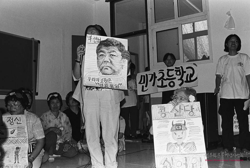 - 민가초등학교' 무대에서 민가협 어머니들이 연극을 하고 있다. 오른쪽에서 서경순 민가협 어머니가 귀에 꽃을 꽂고 '공산당이 싫어요' 피켓을 들고 있고, 조순덕 민가협 어머니가 박 홍 총장 얼굴이 그려진 '우리의 소원은 '멸공통일'이라는 포스터를 들고 있다
