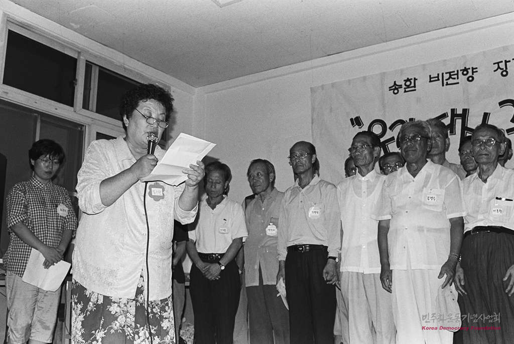 2000년 민가협 여름 수련회 : 2000년 9월 2일에 송환되는 비전향 장기수들에게 편지를 낭독하고 있는 임기란 민가협 상임의장