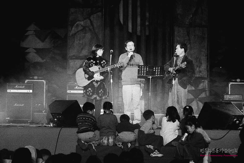 - 12회 양심수를 위한 시와 노래의 밤'에서 정태춘씨, 박은옥씨, 홍세화씨가 함께 노래하고 있다.