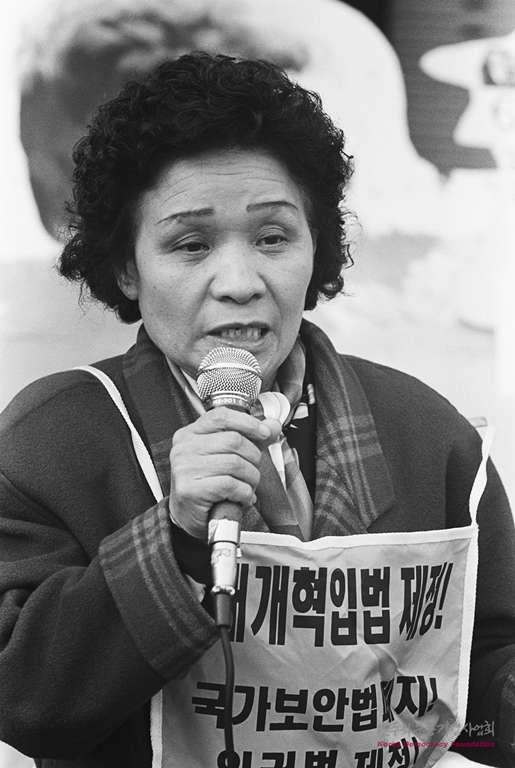 국가보안법' 위반으로 연행된 아들 임태열의 석방을 호소하고 있는 한평수 민가협 어머니