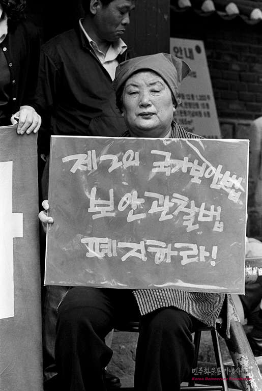 - 임기란 민가협 상임의장이 '제2의 국가보안법 보안관찰법 폐지하라!' 피켓을 들고 있다.